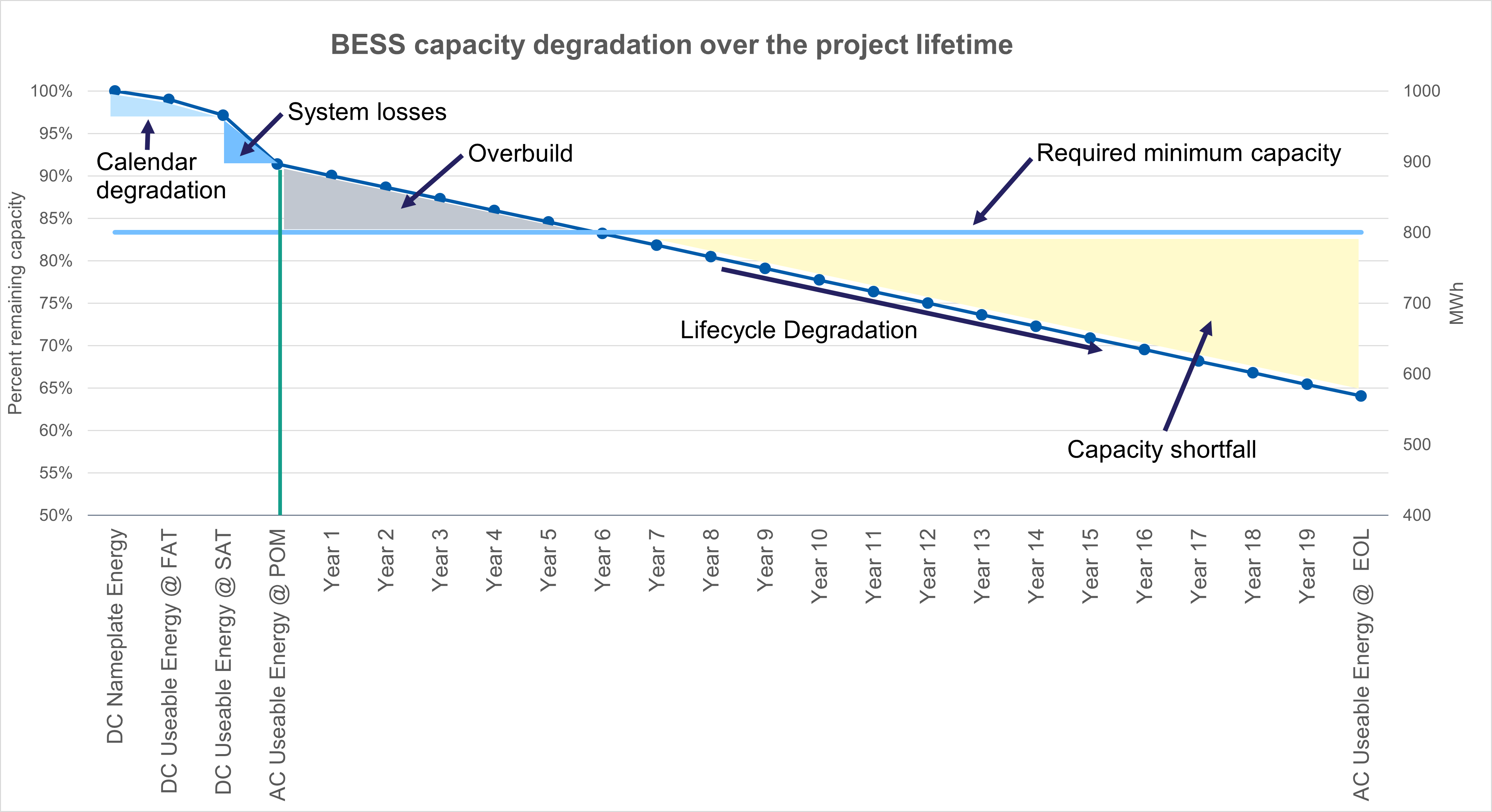 BESS sizing is also uniquely difficult because its performance is constantly subject to capacity degradation and system losses. Some battery capacity is lost due to calendar degradation, which occurs naturally from the time a battery is manufactured until the system operation begins. The duration and temperature during storage of batteries can significantly impact the severity of the calendar degradation. Throughout the project term, battery systems are subject to cycle life degradation, which is the capacity lost during year over year operation. The speed of this degradation varies based on the duration and frequency of each charge and discharge cycle. Capacity will be further reduced by equipment inefficiencies, cabling, and parasitic auxiliary losses.